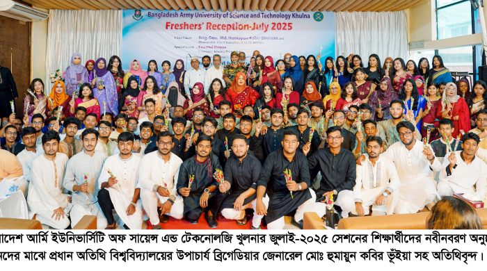 নিজস্ব প্রতিবেদক. বাংলাদেশ আর্মি ইউনিভার্সিটি অফ সায়েন্স এন্ড টেকনোলজি, খুলনার জুলাই ২০২৫ সেশন চতুর্থ ব্যাচের শিক্ষার্থীদের নবীনবরণ অনুষ্ঠিত হয়। বিশ্ববিদ্যালয়ের তৃতীয় ব্যাচের শিক্ষার্থীরা এ নবীন বরণ অনুষ্ঠানের আয়োজন করে। সোমবার